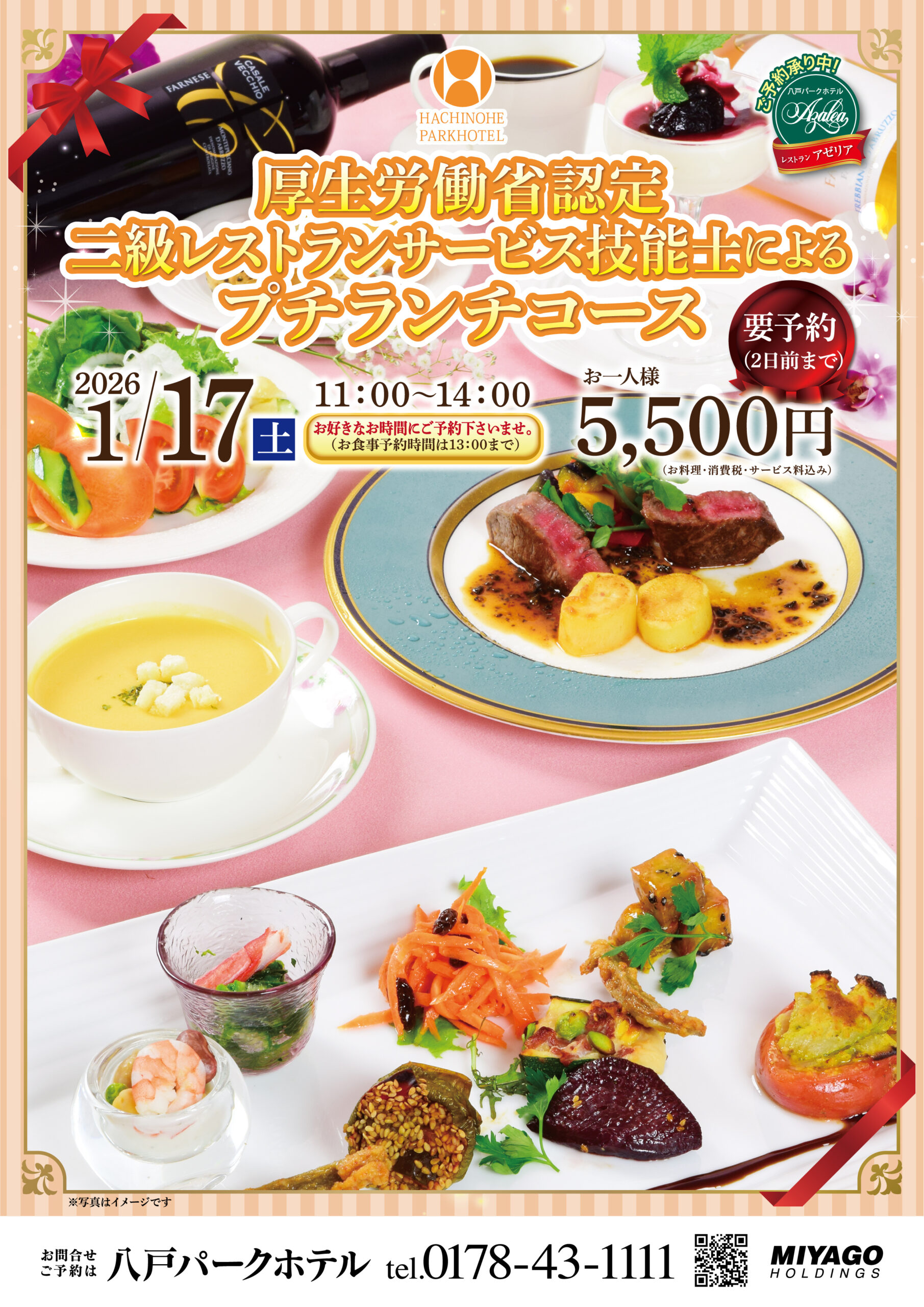 厚生労働省認定二級レストランサービス技能士によるプチランチコース 2026.1.17(土)11:00〜14:00